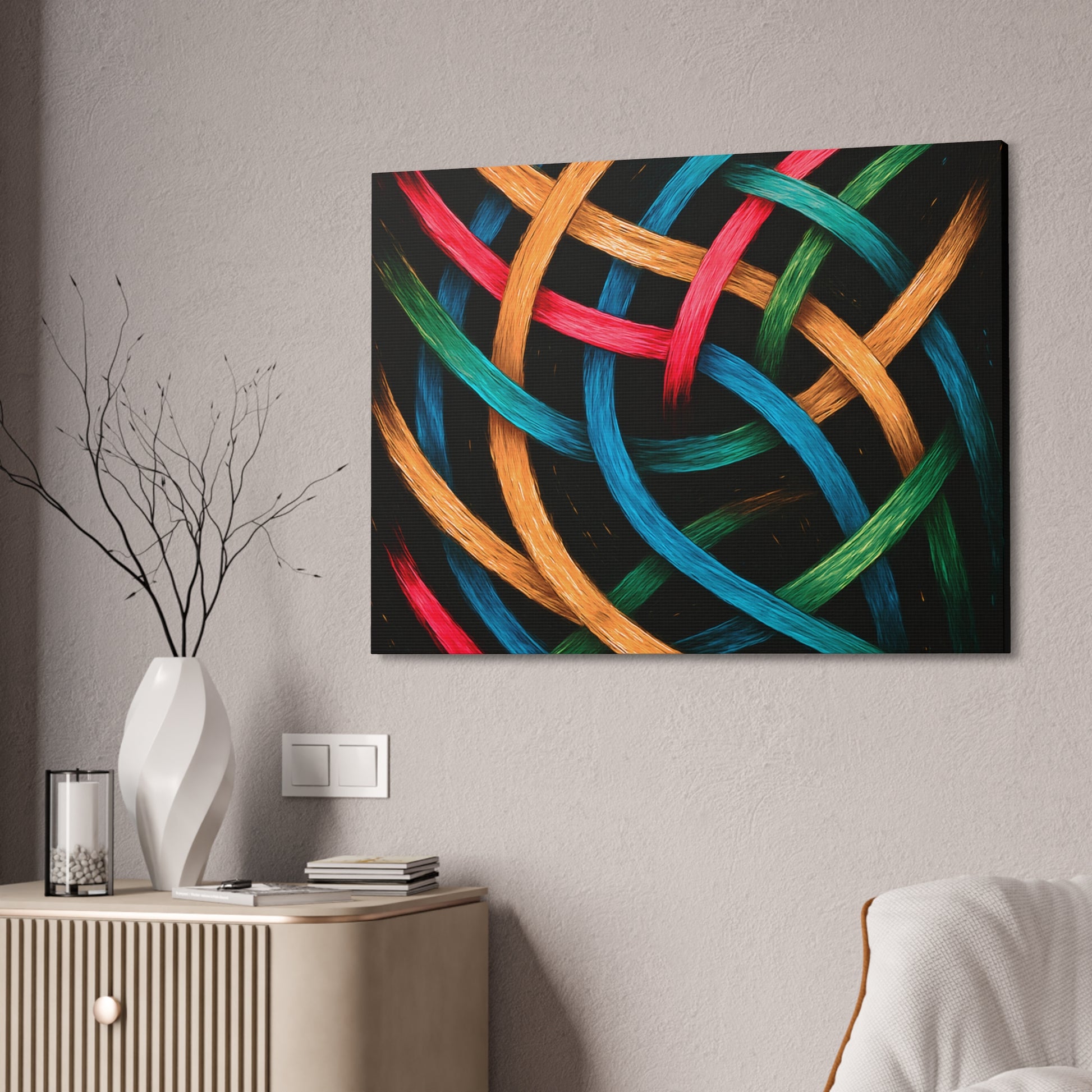 Transform your space with this stunning Canvas Stretched artwork, designed to bring a vibrant and inviting atmosphere to any room. Featuring an intricate weave of colorful fibers against a dark backdrop, this piece sparks creativity and joy, making it a perfect addition to homes, offices, or creative studios. Ideal for art lovers, DIY enthusiasts, and anyone looking to elevate their decor, this canvas makes a thoughtful gift for housewarmings, birthdays, or holidays like Christmas and Thanksgiving. Instantly brighten your walls and inspire happiness with this eye-catching canvas that resonates with style and personality, perfect for any celebration or everyday enjoyment.