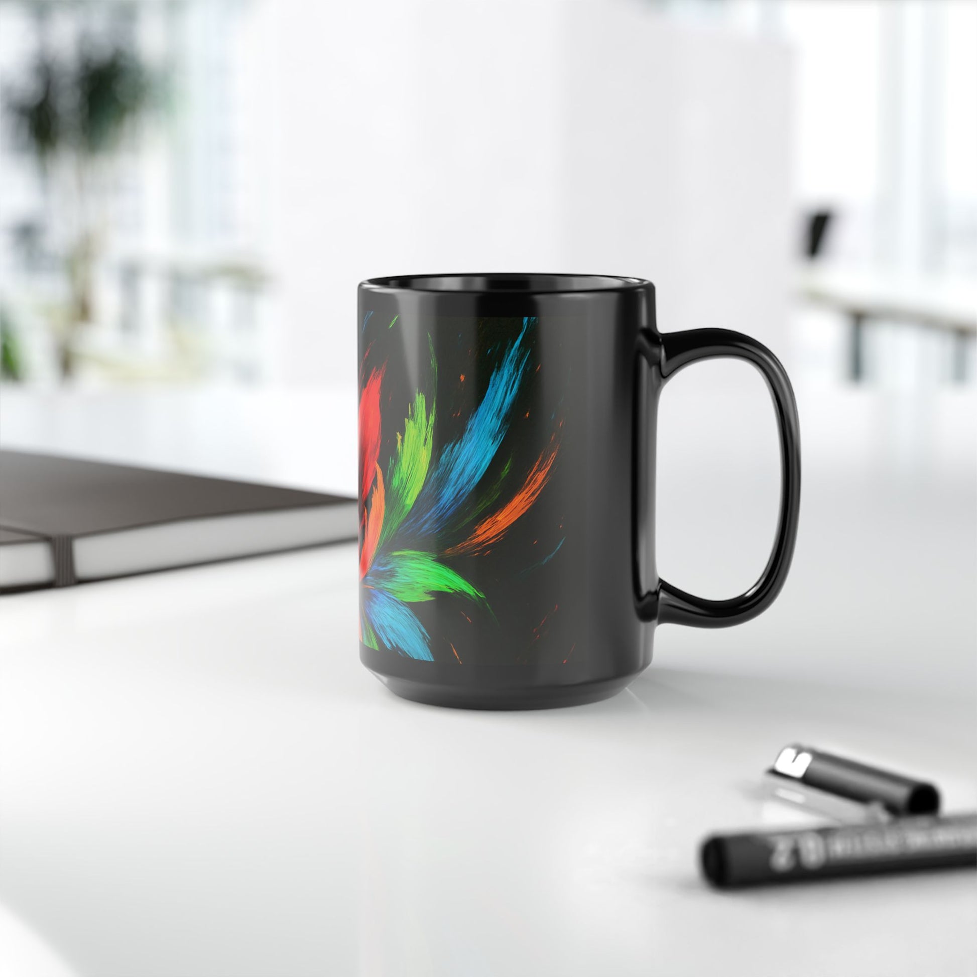 Elevate your beverage experience with this stunning black mug. Featuring a vibrant floral design, it adds a pop of color to your morning routine or cozy evening. Crafted for comfort, the C-shaped handle ensures a secure grip, making it perfect for sipping your favorite coffee or tea. Ideal for anyone who appreciates art and aesthetics, this mug is a perfect gift for art lovers or those who enjoy unique kitchenware. It's a great addition to your home or office, creating a bright atmosphere that sparks creativity. Celebrate special occasions such as birthdays, holidays, or even casual get-togethers with friends and family, making each sip a delightful experience.